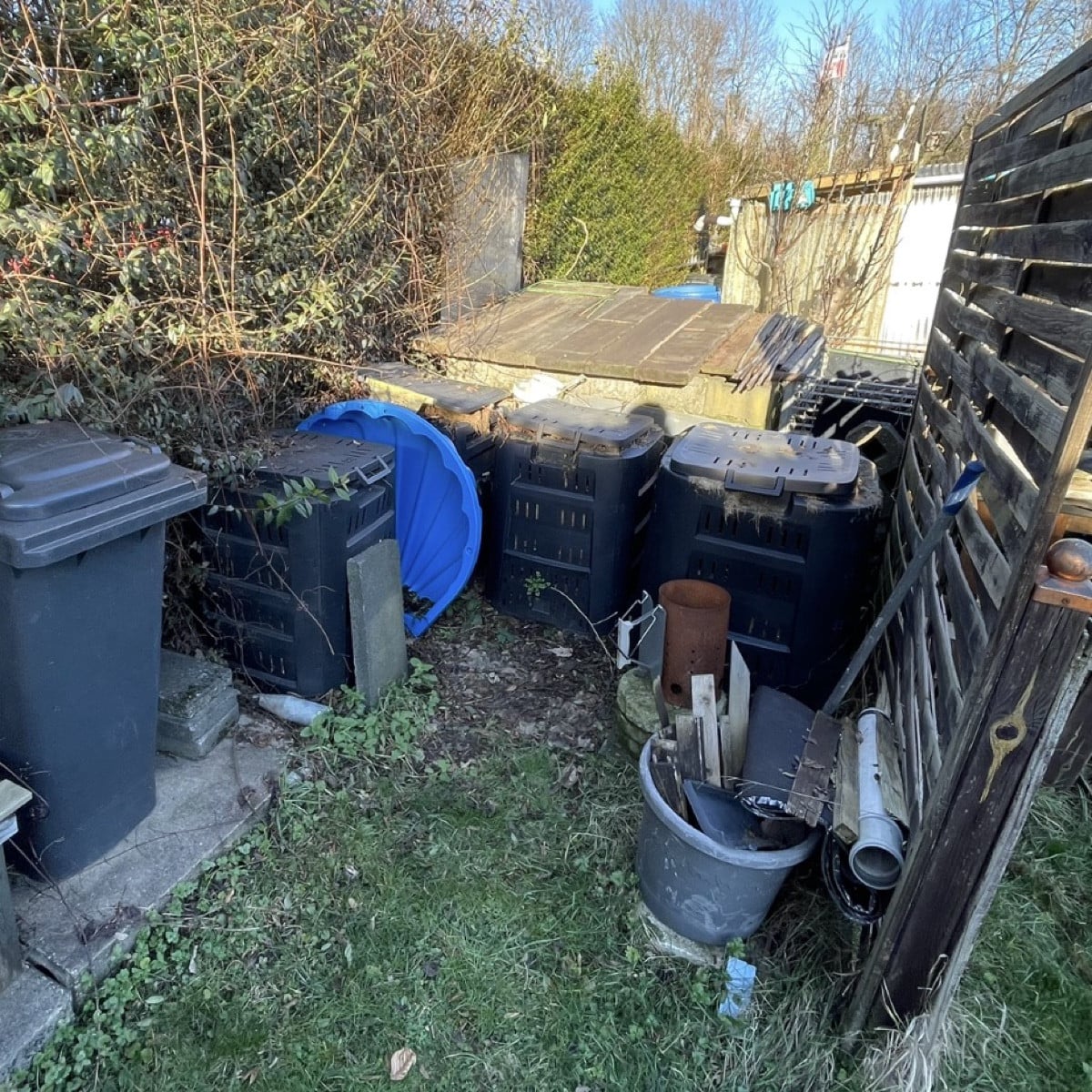 Compost Update. We did it! We got rid of the quick-compost bin and built a new compost corner. Luckily, we’d saved up a lot of materials, so we were able to layer everything nicely and spread our first batch of compost (not much) over two beds. 🎉 In the first photo, you can see the old compost corner, and in the other pictures, the new one (work in progress).