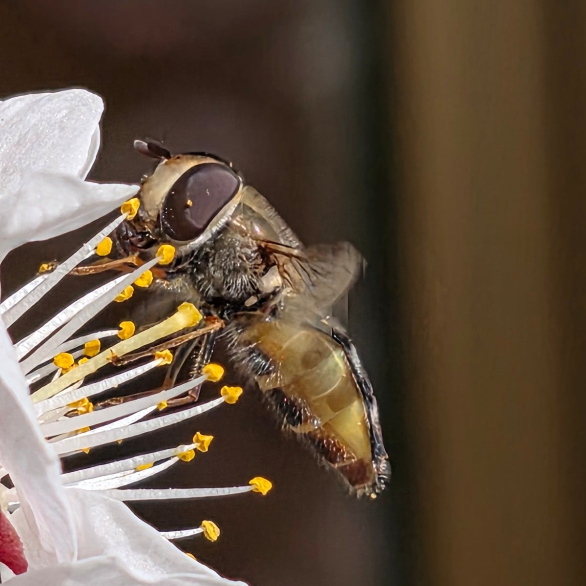 Insect spam on almond and apricot blossoms There is nonstop buzzing and humming here. Among them is the late large-headed hoverfly, which can be easily identified as a hoverfly by the following characteristics: Its eyes are very large, its antennae are relatively short, and it masters its impressive hovering flight with only one pair of wings (pictures 1-4). In comparison, the blue carpenter bee has much longer antennae, smaller eyes, and two pairs of wings (picture 5).