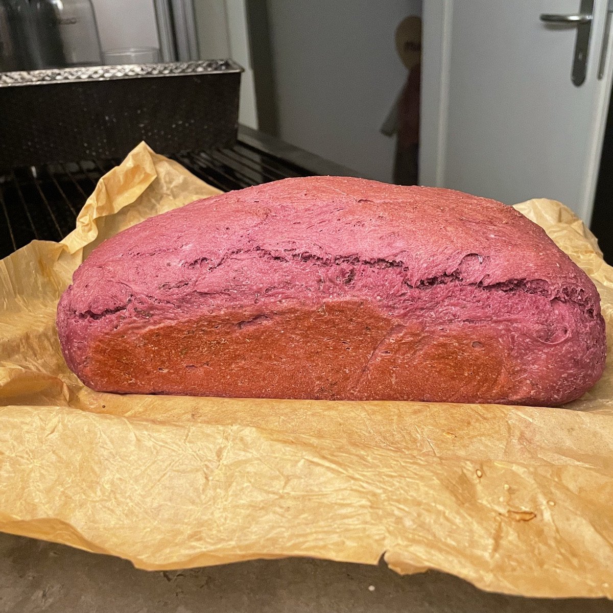 Sweet potato bread made from purple sweet potatoes. Recipe: 300g mashed sweet potatoes 400g spelt flour 150ml lukewarm water 1 bag of dry yeast 1 tsp salt 1 tbsp olive oil First mix the dry ingredients, then add the others and knead into a dough by hand. It should be sticky but not wet. Add flour or water if necessary. Then leave to rise for 1 hour. Place in a loaf tin and leave to rise for another 15 minutes. Then put in the oven for about 25-35 minutes. At 180 degrees fan. I also added oregano 😋