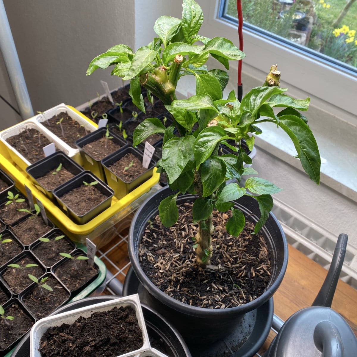I’m so proud of my first overwintered bell pepper 🥰 ….. and you can already see the first flowers…. The variety is called Ference Tender. I sowed and harvested them myself last year 🥰 I gave them some fertilizer for the first time last week. When it gets significantly warmer, I want to repot them and put them in the greenhouse for now. Do you guys maybe have a few tips for me….? Have a wonderful day, everyone! Lalelu