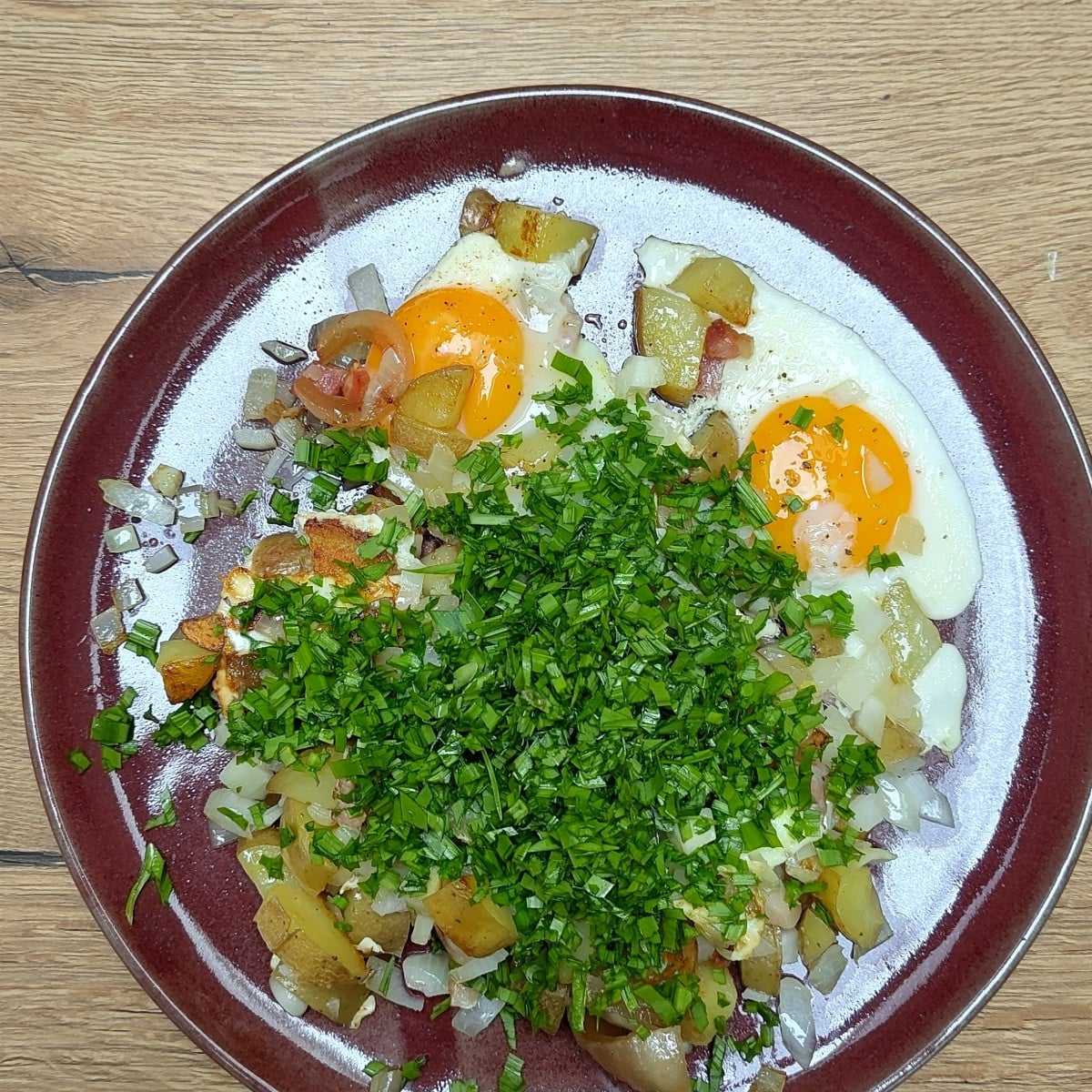 A ladies' breakfast for a long day: -Potatoes from the day before, -Bacon -Onion -2 eggs And a big handful of "wonder garlic" (Berlin wild garlic). And while we're at it, maple blossoms and leaves work just as well for garnishing as the "wonder garlic." 🤩 However, the "wonder garlic" (presumably invasive) is slowly taking over in the warmer areas. I highly recommend harvesting it soon. I find it tastes much better than real wild garlic, because it’s less “bear-like”—that is, less pungent. Plus, with it growing in such abundance, you really don’t need to feel guilty about harvesting it. Quite the opposite, in fact: if you don’t let it spread further, you’re giving the anemones and other little plants that actually belong there a bit of a head start.