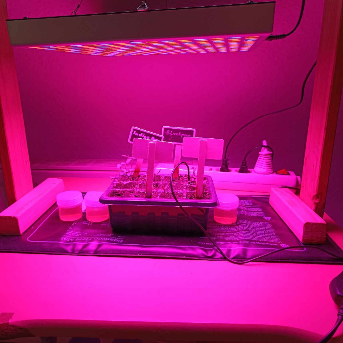 Growing from left to right: Indigo Rose, Matina, block peppers, and snack peppers in a mini greenhouse and in small pots from left to right: Superschmelz, Marketmore, and block peppers, as only one seed has germinated so far.