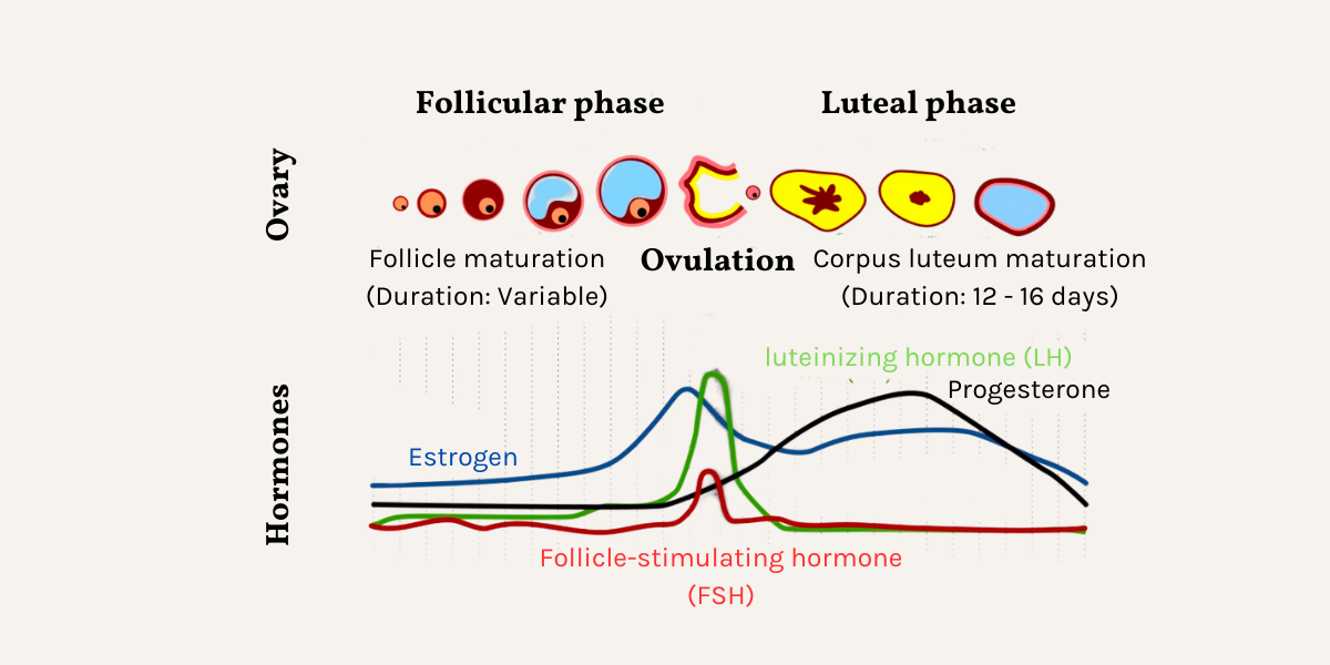 During the follicular phase, estrogen levels rise, peaking just before ovulation. If estrogen levels are too low, it can lead to cycle irregularities or even a missed period, as ovulation may be delayed or fail to occur. Other symptoms of estrogen deficiency include sleep disturbances, hot flashes, vaginal dryness, infections in the vaginal or urinary tract, frequent urination, itching, and even osteoporosis.