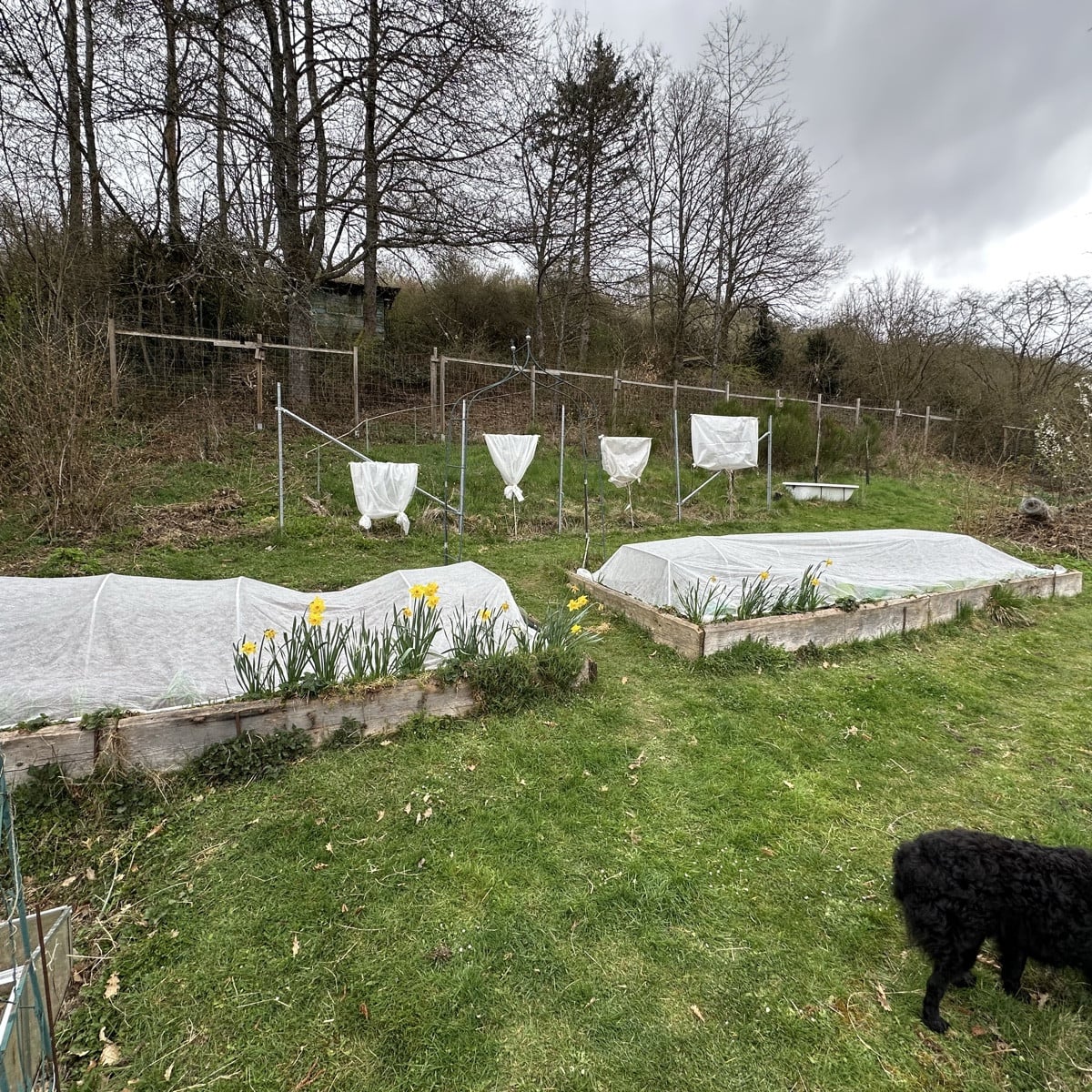 I just finished laying the fleece over the beds and securing it with metal rods, and here comes the first hailstorm ❄️. In the meantime, I wrapped the kiwi berries in fleece too. I hope it all holds up. There are some fierce gusts of wind 🙈. Is it April weather where you are too? ☃️🍀💚
