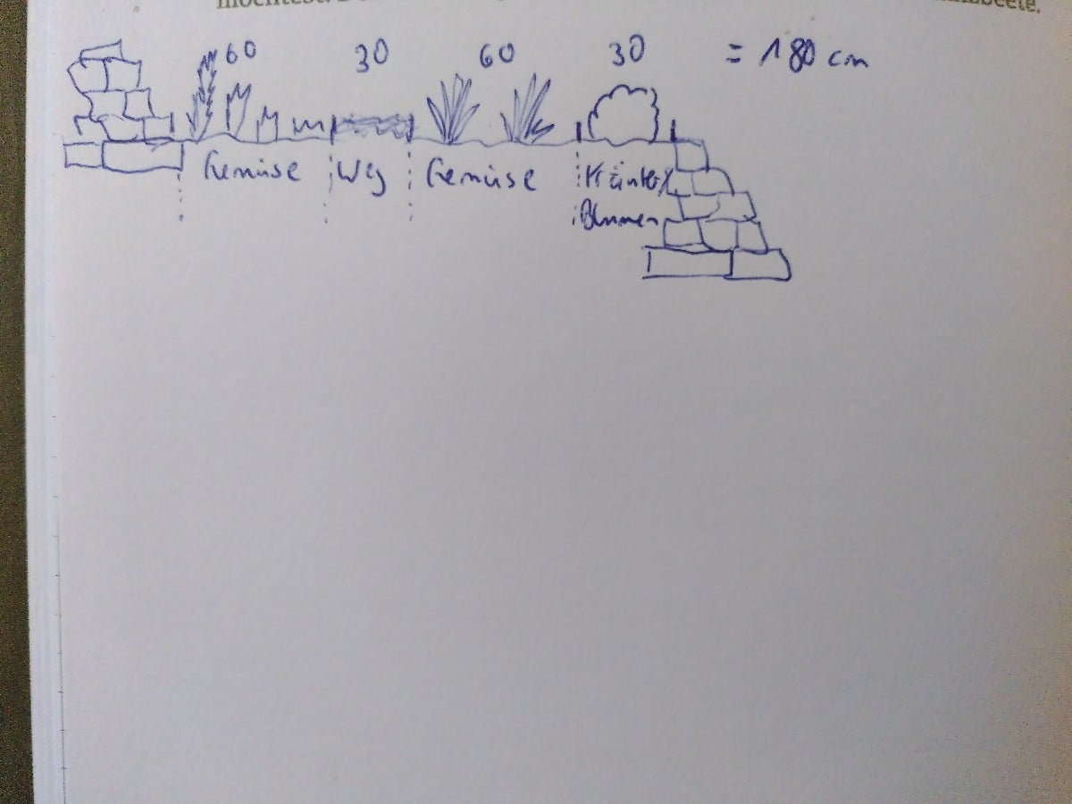 Hello, clever people! Last year, we moved into a house with a garden on a slope. I would now like to build a few terraces for vegetable beds. Since this will be more or less "forever," I want to think everything through carefully. I have sketched a cross-section of a terrace. It should have a slight slope away from the direction of the slope so that rainwater can seep away as much as possible. For these reasons, drainage is not planned. On/in front of the wall crown, I have planned a 30 cm wide planting strip for perennials and herbs that tolerate dry conditions well. What do you think? Do you have any comments? Thank you very much!