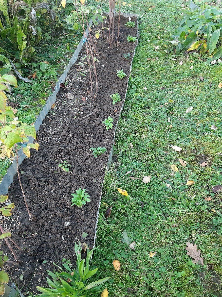 #raspberries Underplant instead of mulch. Here with #forgetme. Moving from the house garden to the big garden. I have so many of them. They are easy to move in the fall. There's also a #violet. Marigolds will follow next year. I've even managed to grow some ribwort plantain in the corner.