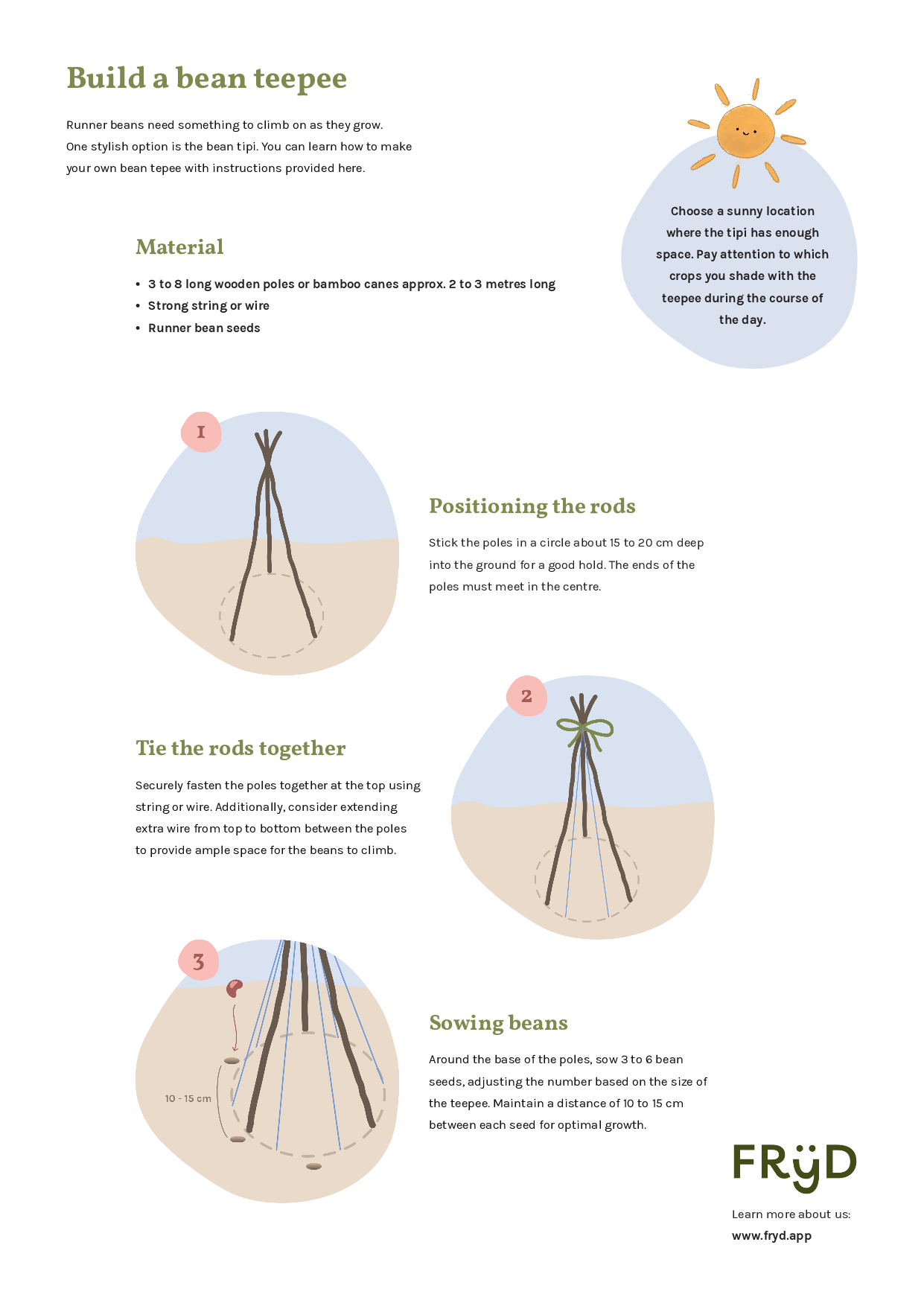 Wooden poles 2 m/2.2 yd high are used as climbing supports. These are either dug in vertically or leaned against each other in rows and stabilized with a crossbar. It is important to pay attention to the direction of the compass so that the beans do not shade themselves too much. Alternatively, the poles can also be used to build a "bean tipi" (= tent). In a milpa, which is a mixed culture with beans, pumpkin and corn, the corn serves as a strong climbing aid for the beans. You Can Find Out How to Set Up a Milpa and What a Milpa Is Here.