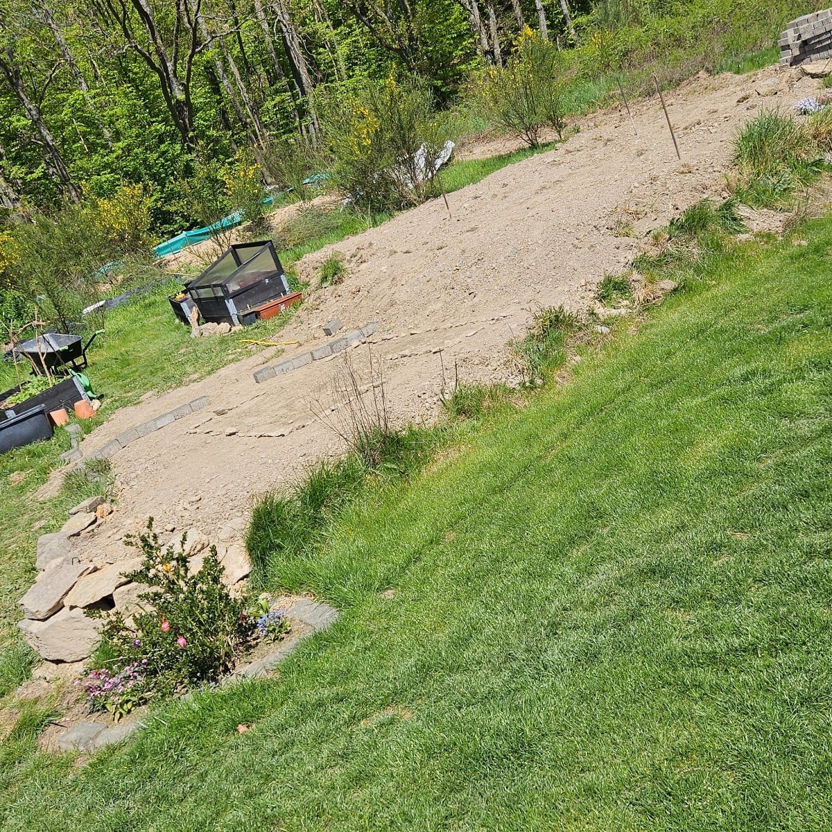 Ich freu mich schon so! Wir haben jetzt den Boden für den zukünftigen Gemüsegarten terrassiert und die Eckpunkte des Gewächshauses (rechts) abgesteckt. Bislang wurde nur in provisorischen Palettenrahmen gegärtnert. Aber vielleicht kann ich nächstes Jahr schon so richtig loslegen. Der Traum vom großen Gemüsegarten wächst 🤩
