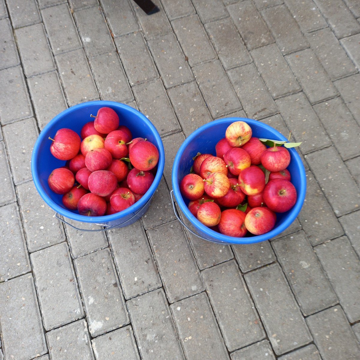 Schnell noch 2 Eimer Granny Smith gepflückt. Ja, gibt es auch in rot. Sonst waren aber nur so gestreift wie im rechten Eimer zu sehen. Dieses Jahr sehr klein, aber sehr viele. Schätze noch 3 Eimer. Und dann geht es ans Dörren