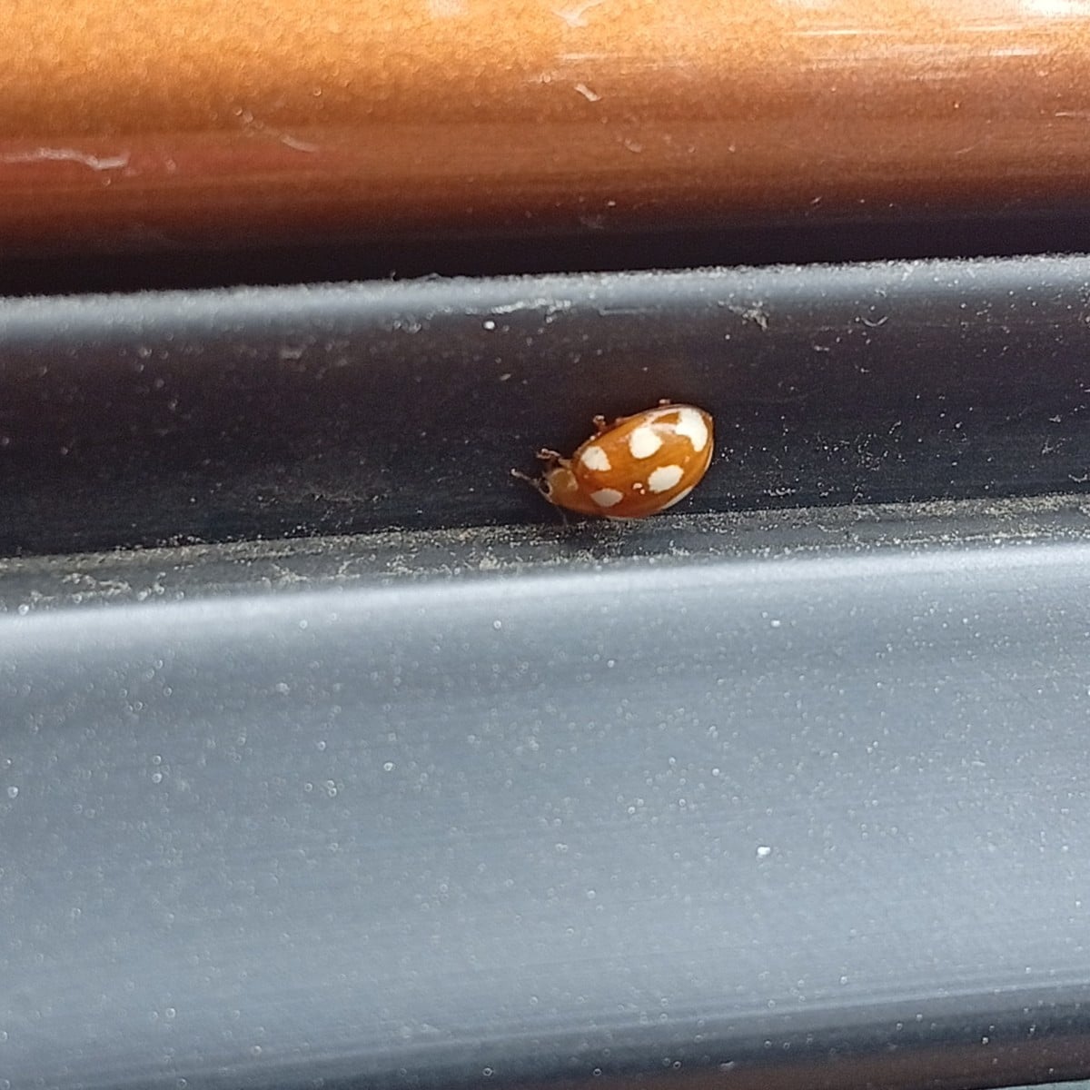 Der Zehnfleck-Lichtmarienkäfer hat sich wohl etwas verirrt oder wollte eine kleine Weltreise mit unserem Dacia machen. Dieser hier frißt Blattläuse. Der 12- & 16-Punkt-Lichtmarienkäfer dagegen frißt am liebsten Mehltaupilze.