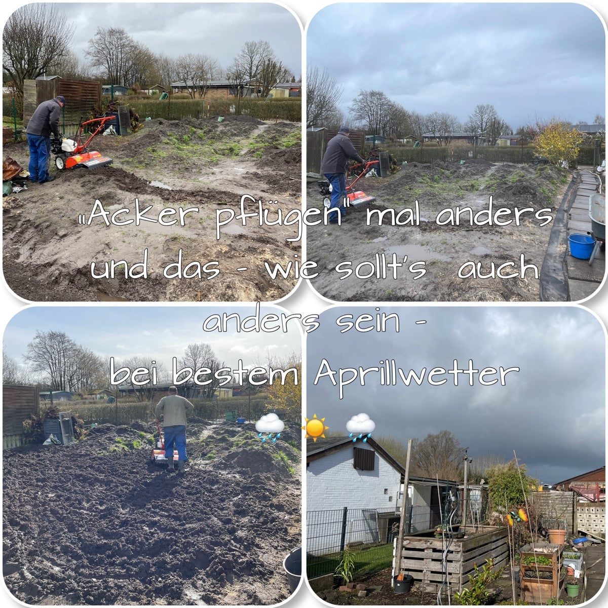 Wir haben letzten September gebaggert und alles kreuz und quer liegen lassen. Nun gehen wir mit der Frese durch und sammeln das Unkraut raus. danach arbeiten wir Kalk ein. Alles um den Boden aufzulockern, den Ackerschachtelhalm zu ärgern und den Boden zu verbessern.