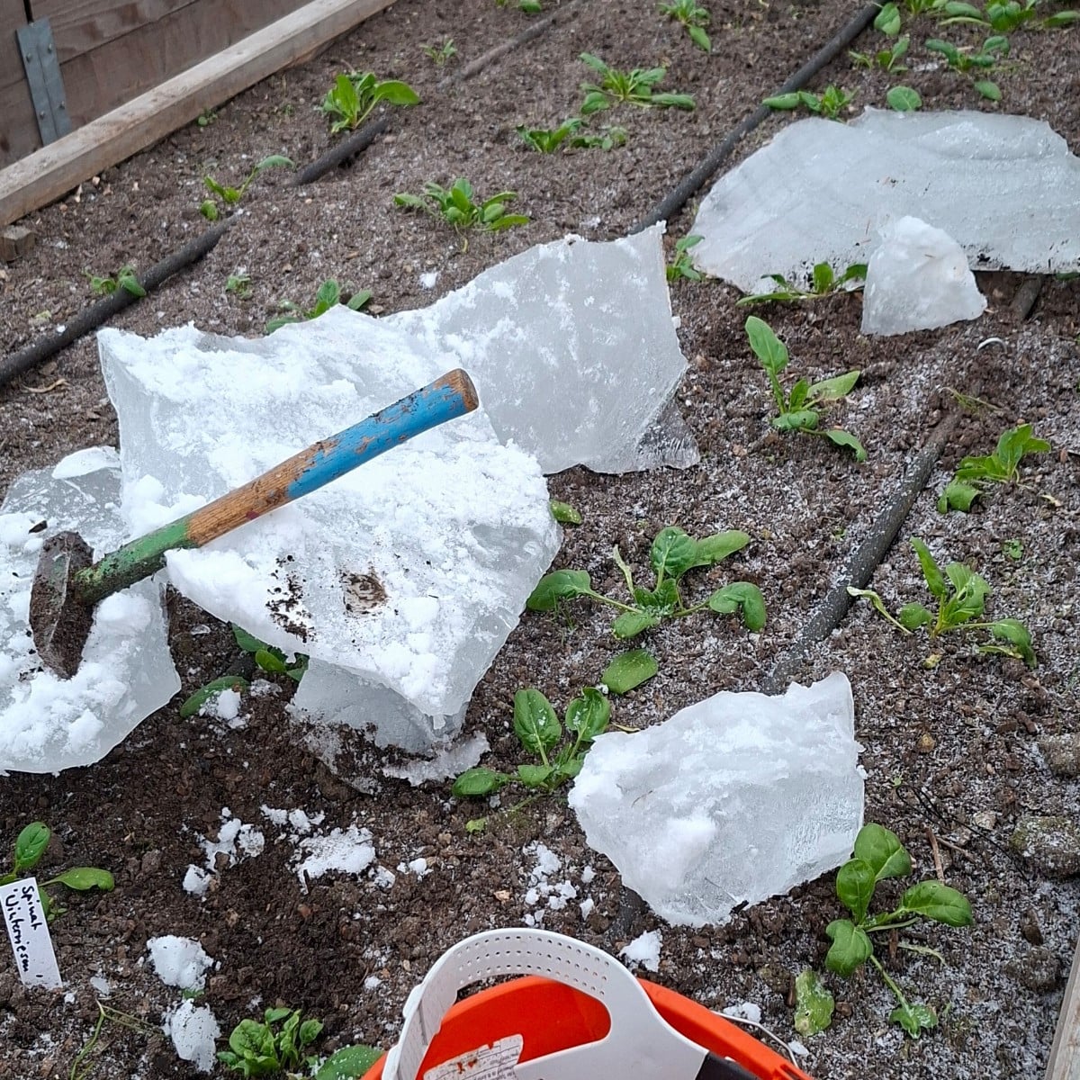 Hallo zusammen. Ich möchte euch ans Herz legen gefrorenes wasser oder dicke schichten schnee von euren folientunneln zu entfernen. Das ist zu viel gewicht. Ich habe gestern versucht element 2 von folientunnel 2 zu retten, damit es vom gewicht nicht komplett zusammenbricht. Leider hat das die folie schon aufgeschlitzt während des entfernen.um größere schäden zu vermeiden empfehle ich euch das gefrorene zu entfernen. Aber passt bitte auf euch auf. Das ist nicht ganz ungefährlich. Denn wenn euch so ein brocken eus auf die birne fällt.....ende im gelände. Ich hatte meinen sägehelm auf. Bis zum nächsten Post. Frostige grüße aus husum