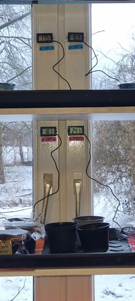 Ich freu mich grad über mein Anzuchtregalentwicklungsexperiment 😅 (Hintergrund ist, dass ich an meiner Anzuchtorganisation bastel und gerade der Januar bietet sich da für Experimente an, weil ja sozusagen noch nicht im 'Realbetrieb'). Ich hab meine Januarkinder in 3 (4) Temperaturgruppen sortiert und aktuell alle an meinem Südfenster stehen. Alle mit Sensor bestückt. Oben die zwei kühleren (Soll bei beiden ist 17°C, der Min-Max-Bereich und die 'Nach-Keimung-Temperatur' sind unterschiedlich, daher 2 Gruppen) und das ist sozusagen aktuell die 'natürliche' Temperatur. Unten stehen die beiden wärmeren Gruppen (Tomaten links, Paprika rechts). Unter die rechte Hälfte vom Warm-Tablett hab ich ne Heizmatte geschoben, die die Temperatur im Soll-Bereich hält, die linke Hälfte wird nur halbwegs mitgewärmt, weil es ja dasselbe Tablett ist - und es ergibt sich gerade genau die Soll-Temperatur 🤩🤩🤩 So cool, wenn man sich was ausdenkt und dann klappt das auch noch 🎉