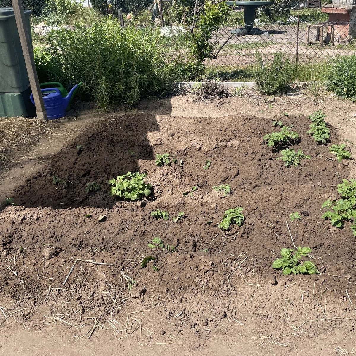 Endlich geht es mal zügig voran!! Die erste Sorte Kartoffeln hat schon richtig viel Blattwerk. Ich hab nur mit den Reihen etwas geschludert, da musste ich die Wälle neu aufhäufeln. Das zweite Beet ist dafür umso sauberer angelegt. 😅 Erdbeeren habe ich die vier vorderen Reihen neu gepflanzt, weil die hinteren eher kümmerlich gewachsen sind - trotz Düngung. Richtig gut kommen jetzt die beiden Johannisbeerbüsche - einer schwarz der andere rot. Und im Frühbeet (letztes Bild) sind Salat und Kohlrabi wie im Bilderbuch gewachsen. Jetzt lasse ich den Glasdeckel weg, etwas in Sorge, weil es nachts ja noch ziemlich kalt wird.