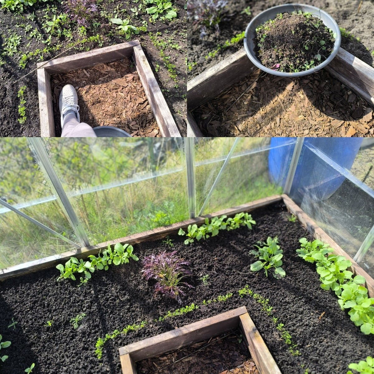 Dieses wohlige und entspannte Gefühl wenn man ein sauberes Beet hat. Kennt ihr das? Dennoch habe ich dieses Jahr sehr lange damit gewartet. Es lohnt sich. Im Gewächshaus keimen viele Dinge, die man evtl. Im Garten gern haben möchte. Ich habe sehr viel patagonisches Eisenkraut, Sonnenblumen und Kamille und Amaranth drin gehabt. So spät man sich die Voranzucht. Und Mann lässt die Pflanzen erstmal noch solange drin, bis die in den Garten können. Oder man schnappt sich Töpfe und nimmt sie erstmal mit oder lässt sie im Gewächshaus. Je nachdem wie oft man in den Garten kann. Ich nehme sie mit da ich nur alle 3 Tage dort bin.