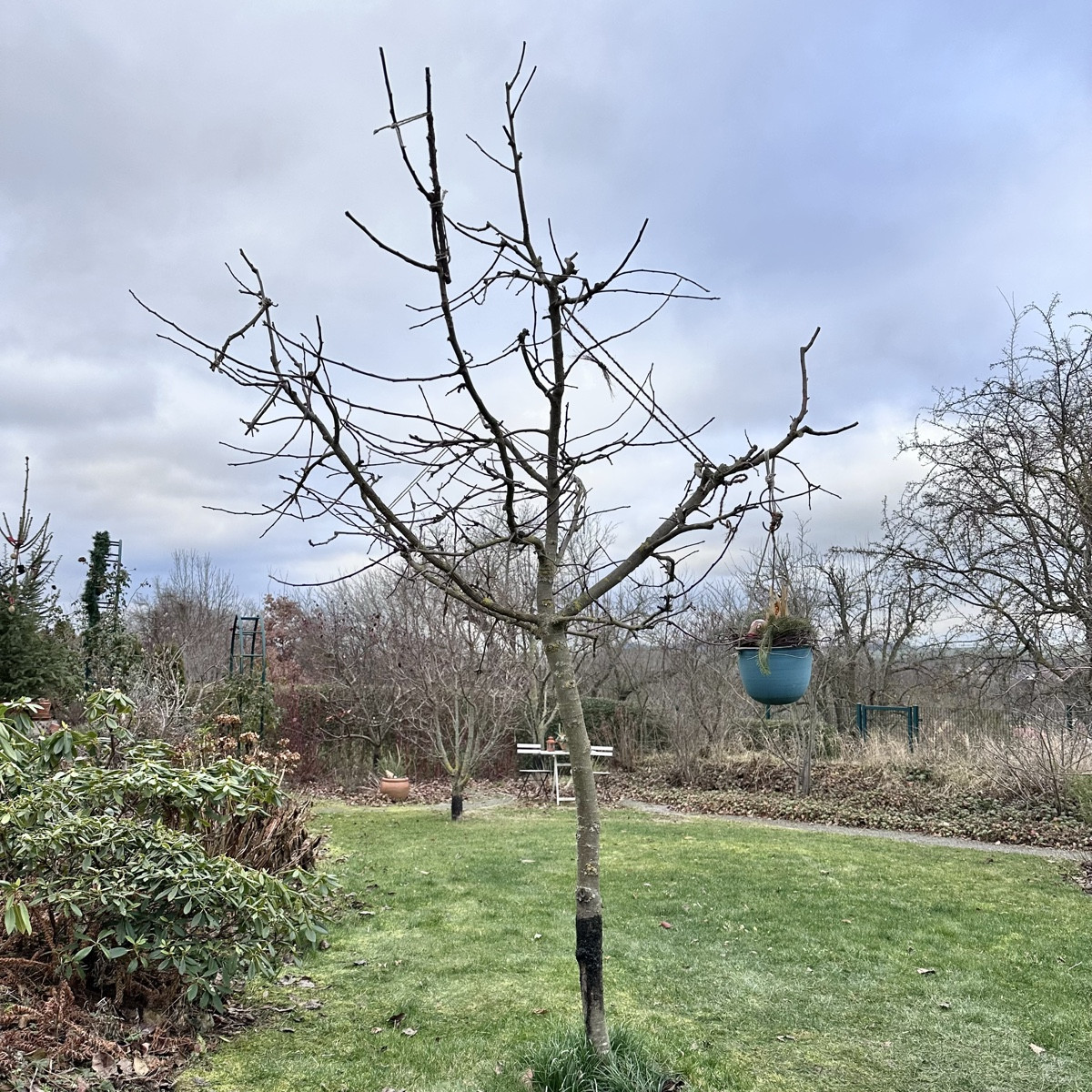Heute meine klassische Feiertagsbeschäftigung: #BaumBondage bei der Anverwandtschaft. Das Praktische: wenn man das regelmäßig (und systematisch) macht, hat man im nächsten Jahr wirklich kaum noch Arbeit. Es ging heute echt fix (noch fixer, wenn ich mein eigenes gutes Werkzeug dabei gehabt hätte und nicht die alte rostige Säge und die klobige Elektroschere der Baumbesitzer 😬 Säge war zum Glück bei diesem Baum gar nicht im Einsatz 😮💨) Im Vergleich zum letzten Jahr habe ich wirklich wenig rausholen müssen, kaum zwei Hand voll einjährige Triebe, das war's. Und die können direkt nach drinnen in die Vase um noch mehr Weihnachtsdeko dran aufzuhängen ;) Ich bin sehr zufrieden damit, wie er sich entwickelt, aber "alle Äste bis auf der ganz rechts" müssen noch deutlich aufholen, deshalb habe ich den rechten sehr gestutzt und allen anderen möglichst viel zukünftige Blattmasse gelassen. Dass er wirklich in Saftwaage geschnitten ist, müsst ihr mir einfach mal vertrauensvoll glauben. Durch die Perspektive der Richtung Kamera wachsenden Äste und dadurch dass er an einem leichten Hang steht, sieht das auf dem Foto eher fragwürdig aus. Ich hab alles akkurat gemacht, ich schwöre 🫡 #StreuobstUltras